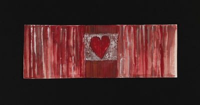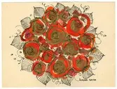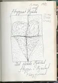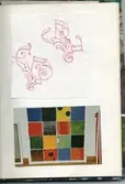 KLM 46157:318:1-2. Skiss, mönsterskiss, papper, färg. Skiss till antependium (:1), i rektangulär form, färglagd i rött, rosa och silver. Påskrift baksida skiss: "Störst är kärleken...
