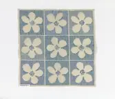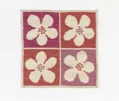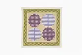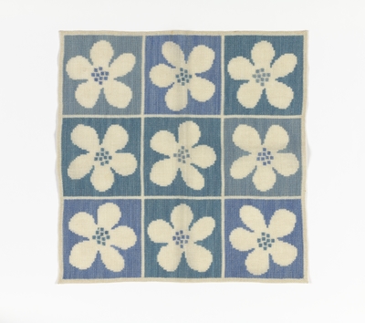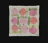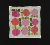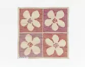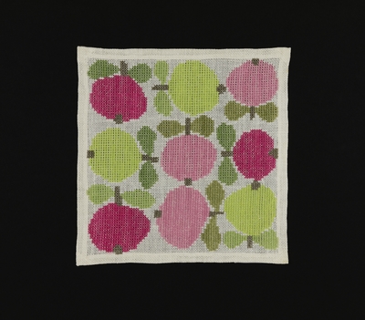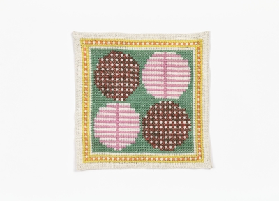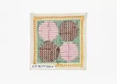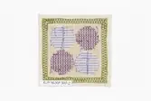 KLM 46157:320:1-2. Duk, textil, 2 stycken. Korsstygnsbroderi med lingarn på naturvitt dalalinne, med fyra cirklar inuti ram. 1: två cirklar med ränder i vitt och rosa, två cirklar ...
