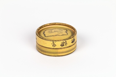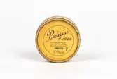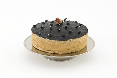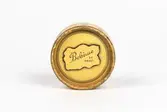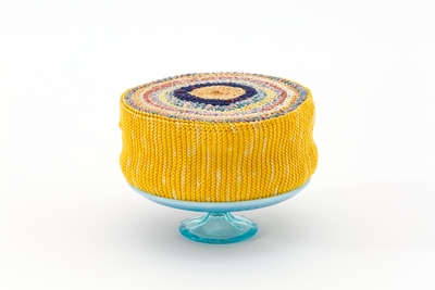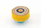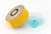 KLM 46157:29:1-2. Konstverk, papper, färg, metall, porslin, glas, textil. Botten tillverkat av papier-maché, dekorerat med svarta ovala stenkolsknappar, fastsatta med knappnålar me...