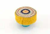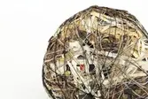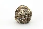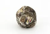 KLM 46157:25. Konstverk, naturmaterial, papper, textil, färg. Klotliknande föremål av papper med limmade bitar av grankottefjäll, vita pappersremsor och godispapper i rött, svart o...