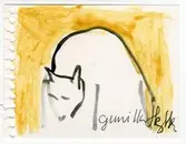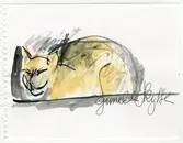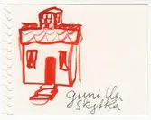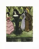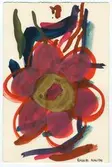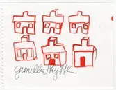 KLM 46157:101:1-8. Kort, konstkort, papper, färg. Åtta stycken konstkort, varav ett med tillhörande kuvert, med olika motiv. Motiven ritade och målade med svart bläck och akvarellf...