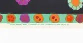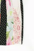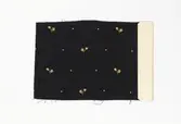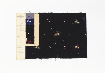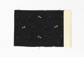 KLM 46157:250:1-2. Tygprov, 2 stycken, textil, färg. Två tygprover i svart syntettyg med broderade blommor i vitt, gult, rött och med inslag av grönt, blått och rosa. På vissa blom...
