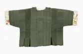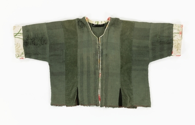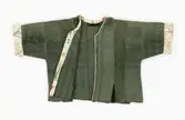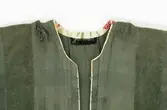KLM 46157:591. Jacka. För dam. Grön. Rak modell med lång ärm. Sydd av två olika tyger, ett grövre bomullstyg med trådränder i blått och rött samt av bredspårig bomullsmanchester. J...