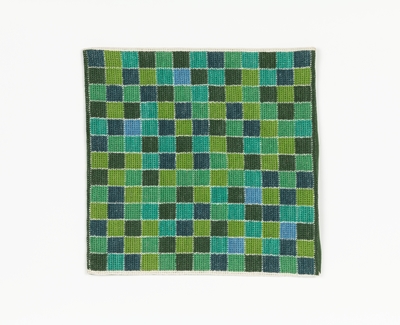 KLM 46157:119:1-3. Kuddfodral, 3 stycken, textil. Tre stycken kuddfodral i olika färgmönster, broderade med lingarn med tvistsöm på linnetyg. Grönt, blått och vitt rutmönster, grön...