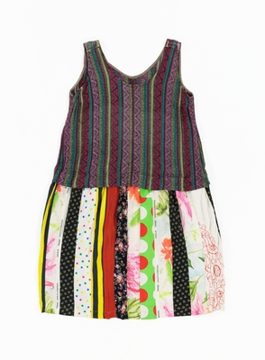 KLM 46157:590. Klänning. Ärmlöst liv av mönstervävt, trianglar och rutor, randigt bomullstyg i rött, rosa, grönt och gult mot svart botten. Halsringning och ärmöppningar kantade på...