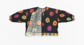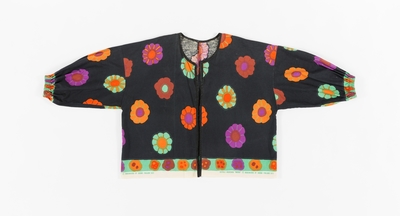 KLM 46157:644. Jacka. För dam. Av svart blommönstrat tryckt tuskaftat bomullstyg. Blommorna är stora, färgglada och strödda över tyget. Rak modell. Utan knäppning, kanter kantade m...