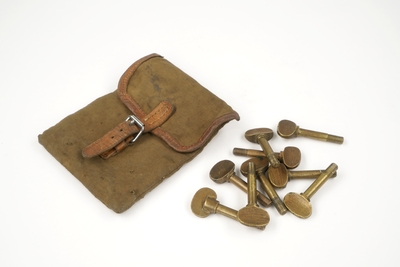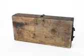 Verktøykasse i tre inndelt i fire langsgående rom og ett rom på tvers, inneholdende fire stk. treskjærerverktøy og diverse sjabloner av messing. samt fire spesialverktøy i messing....