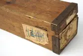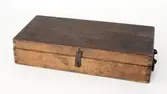 Trekasse med låsbart, hengslet lokk. Nøkkel mangler. Kassen er forsterket med metallbeslag. Lokket kan også låses med to påskrudde lærreimer med spenner. Nøkkelhullet er forsterket...