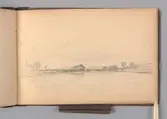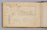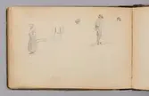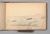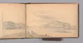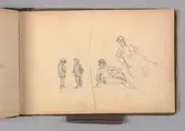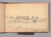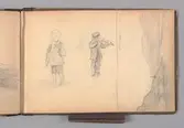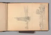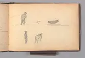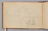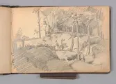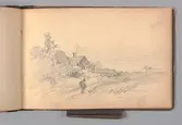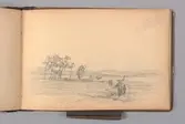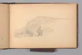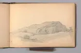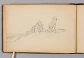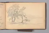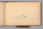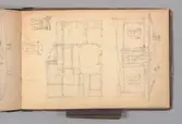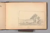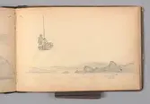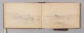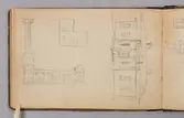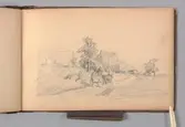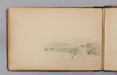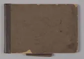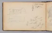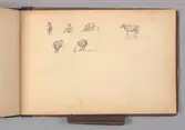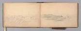 Skissblock; inbundet i hårda pärmar. Liggande format. Skissboken fotograferad i sin helhet och presenterad. Ibland teckning/teckningar eller skisser på ena sidan, främst högersidan...