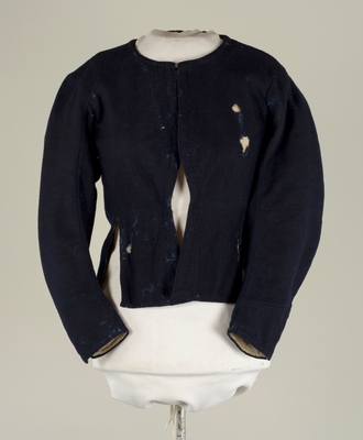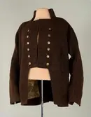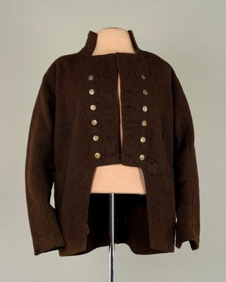 Sammensydd av fire deler. Søm midt i ryggen, buede panelsømmer. Bakoverskrådde skuldersømmer. Dobbeltspent. 6 knapper og 6 knapphull på hver side av rettskåret forkant. 8 cm høy, s...