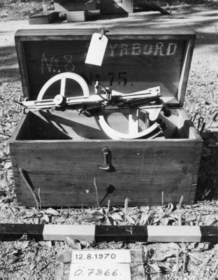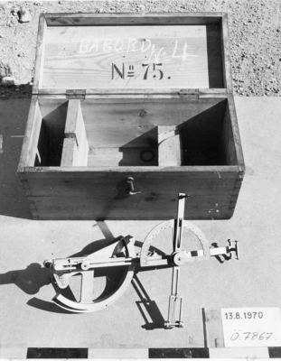 Torpedsikte,lika föreg. N:o 7866. Tillh. torpedbåten N:o 75. Babordssikte. Tillh. låda märkt: N:o 75. Å locket mässings- plåt:"Agne." Modellkammaren i Stockholm 1922. 35 cm....