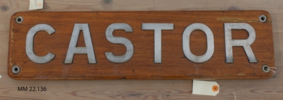 Namnbräda av trä med bokstäver av rostfritt stål: Castor.