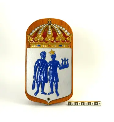 Vapensköld bestående av en metallplatta fastskruvad på en lackerad träplatta. Bilden på vapnet föreställer de två grekiska gudarna Pollux och Castor i blå färg mot en silvrig bakgr...