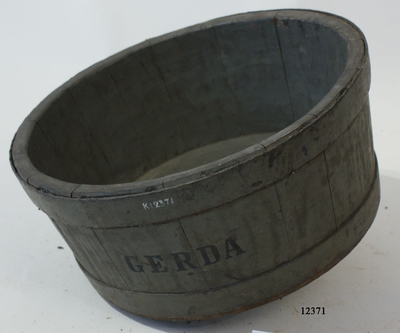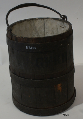 Kanonpyts av trä. Har formen av en stympad kon. Utvändigt målad i mörkgrått, invändigt vitmålad. Beslagen med tre svartmålade järnband samt försedd med smitt svartmålat järnhandtag...