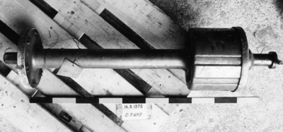 Kammarskruv till 24 cm. k.M/1869 med stoppbult. Cylindrisk med 3 st. släta och 3 gängade sektorer, hävarm med två handtag samt två bultar för vridningsspak. Genomborrad för stötbot...