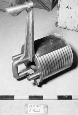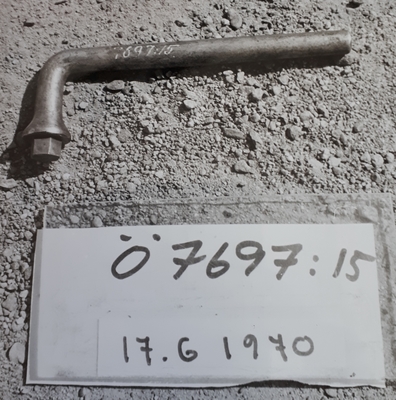Vev, järn, för tillbordssättningsdrevet till 24 cm. k. M/1869. Vinkelböjd med hylsa med 4-kantigt hål för axeln. Märkt:?Gerda ? samt ?4?. Längd: 355 mm Bredd: 245 mm Mod...