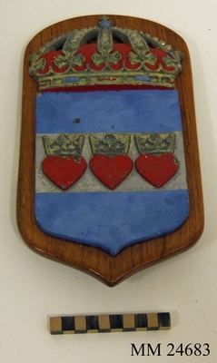 Vapenskölden består av Halmstads stadsvapen i metall fäst på en träplatta. Stadsvapnet är ljusblått. Ungefär mitt på går en grå rand och i den sitter tre hjärtan med kronor på. Sk...