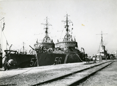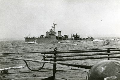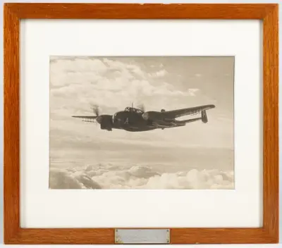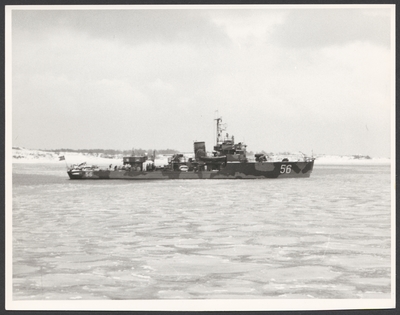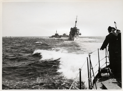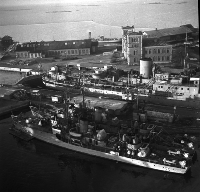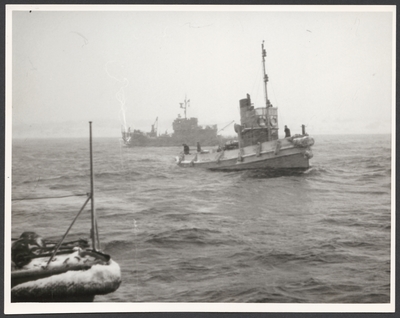 Fotografi inom ram av mahogny. På ramen en bricka av nysilver med inskriptionen: F 17 Bärgning av flp. T 18 B jan. 1949. På tavlans baksida följande text: Skänkt till gunrummet H....