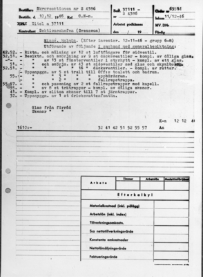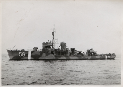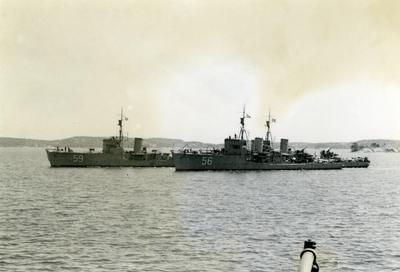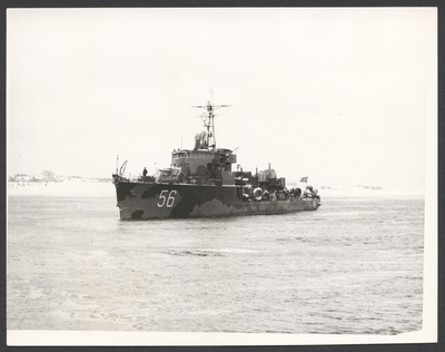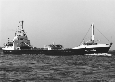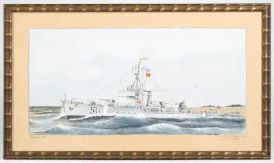 Akvarell, inom ram, av minsveparen Holmön. Fartyget till sjöss med land i bakgrunden. Märkning i blyerts i vänster nederkant: "Holmön" samt i höger nederkant: "SE Svensson? 1943". ...