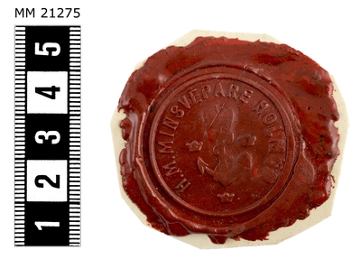Sigillavtryck av rött lack på papper. I mitten krönt stockankare omgivet av tre kronor. Längs kanten text: "HM Minsvepare Holmön".