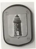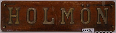 Namnbräda av ekträ med bokstäver av mässing. Text: HOLMÖN.