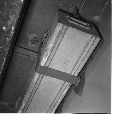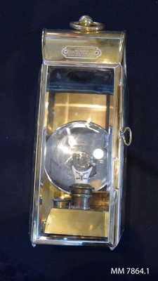 Lanterna, skott-. För fotogen. Rektangulär form med kupig överdel och tre sidor i slipat glas med ena sidan använd som dörr. Invändigt finns en mässingslampa för fotogen och en fö...