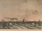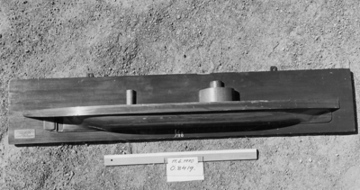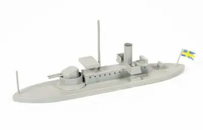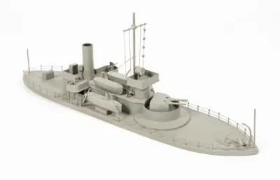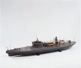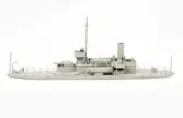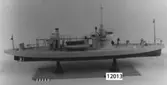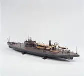 Fartygsmodell, 2:a klass pansarbåten JOHN ERICSSON. Byggd i block med fullständig däcksinredning, roder, vitmålad propeller, gös- och vimpelstake, flaggspel, flagga, gös och vimpel...