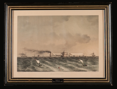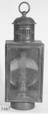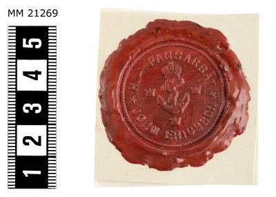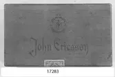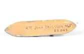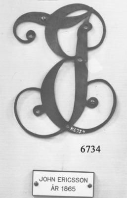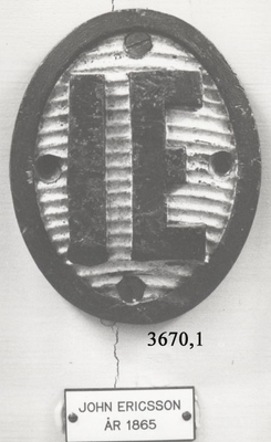 Båtemblem av tenn. Oval sköld med bokstäverna I E. Blått på vit botten. Äldre nummer: K506:10. Har tillhört monitoren John Ericssons båtar. Detta stävmärke utbyttes (före 1895) mot...