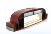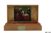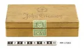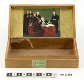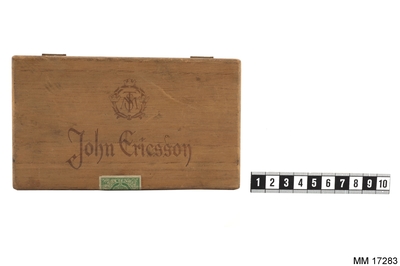 Rektangulär ask av trä, med lock på mässingsgångjärn. På locket inbränt nedsänkt emblem och text: "STM" lagda ovanpå varandra, inramade av lagerkrans med tre kronor samt under embl...