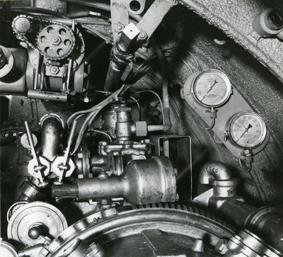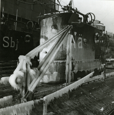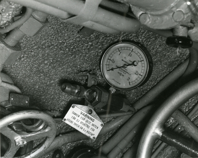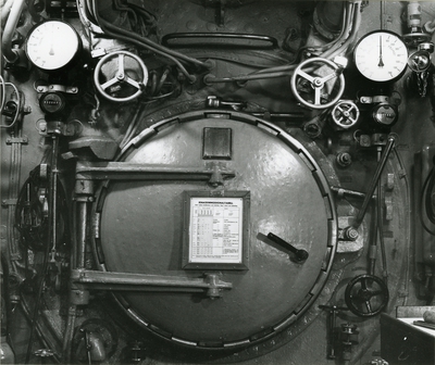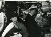 Till vänster papper med fotografi av ubåten Sjöormen i ytläge sedd framifrån, med uppgifter skrivna för hand i rosa och svart: "SJÖORMEN Deplacement:1120 ton Längd: 50,5m Djup:5,6m Fart:11/20knop Besättning:33 Bestyckning: 4 53cm trptub 2 40cm trptub".