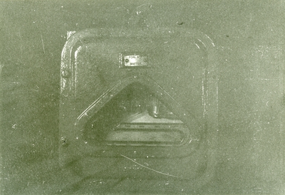 I mitten överst banderoll av mässingsplåt med punsad text övermålad i svart: "1a UBÅTSFLOTTILJEN" samt krönt vapensköld fästad till svartmålad träplatta. Skölden visar svart treudd på guldbotten som sticker upp ur blått hav.
