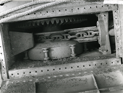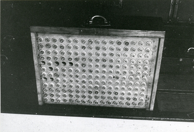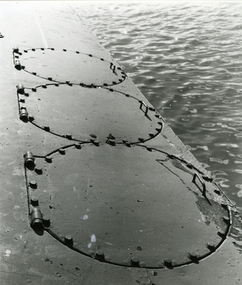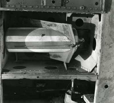 Baksidan är försedd med hopfällbart stativ av trä, att användas för placering på kajen, samt byglar för upphängning.