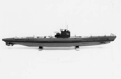 Till höger svartvitt fotografi av ubåten Näcken i ytläge sedd från babords sida, med text: "NÄCKEN Deplacement 1050ton Längd:49,5m Djup:5,6m Fart:15knop Besättning:28 Bestyckning:6st 53trptub 4st 40 trptub".