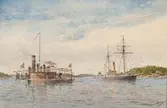 Fartygsmodell, 3. klass pansarbåten SÖLVE, riggad med flagga på flaggspelet. Byggd i block med fullständig däcksinredning, för- och akterroder, 2 propellrar. Gråmålad, röd botten. ...