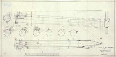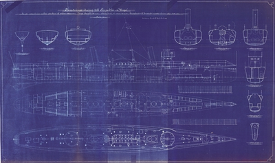 1 st. inredningsritning till Torpedbåten Virgo. Karlskrona Kongl. Flottans Varf i Juli 1903. Utan underskrift.