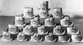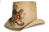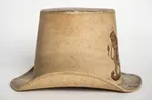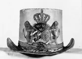 Hatt tillverkad av papp som målats med en crémegul färg. Framtill försedd med svensk-norska riksvapnet i färg. Foder av bomullstyg, 115 mm brett och dragsko.