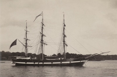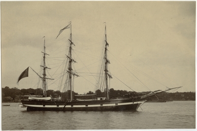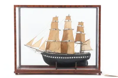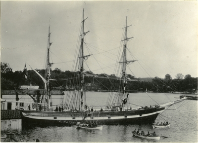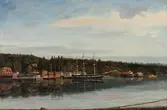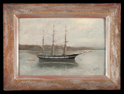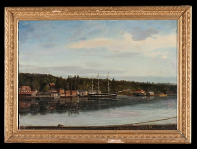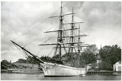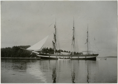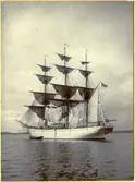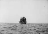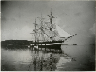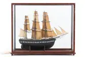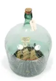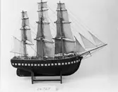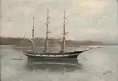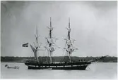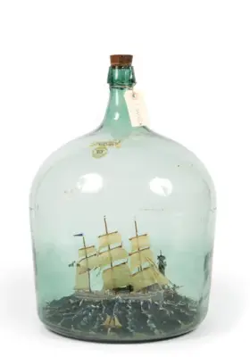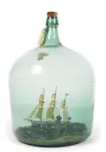 Fullriggaren Abraham rydberg under segel i större glasdamejeanne, landremsa med fyr och byggnader. Sjö av gips. Apterad som el. bordslampa med lamphållare i halsen. Sladd och sti...