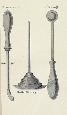 Kruspinne och andra redskap för att göra pappersblommor. Lacre, L de, Den aldra nyaste fleuristen eller lättfattlig anvisning att förfärdiga blommor af papper och tyg. Stockholm 1858.