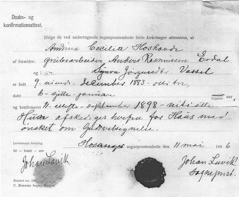 Anna Vassdal (1898-1996) var 14 år då ho sto konfirmant i 1912. Då hadde kleskikken endra seg og ho fekk reise til byen med foreldra for å handle sko og klede. «Det skulle vera kjøpetøy til konfirmasjonskleda.» Etter at kjolestoffet var kjøpt så var det hovudplagg, sko og støvlar som sto for tur. «Ja, eg kunne få ha ein kvit silkeduk! Då sa eg at eg hadde høyrt gjete at dei andre lesarjentene skulle ha hattar. Ja, de kan no kjøpa silkeduk, sa eg, men eg kjem no alder til kyrkje med han!» Anna fortel at mora hadde større forståing for dette enn faren, sidan mora var vaksen opp «ved sjøen» der dei raskare fanga opp nye motar. Anna fekk hatt! «….eg har alder sidan hatt så fin hatt synst eg sjølv.» Kjolesaumen vart gjort av ei flink syerske, som nett hadde sydd ein brurekjole, og brukte same mønsteret til Anna sin konfirmasjonskjole. Anna var godt nøgd: «eg hadde fått so flott konfirmasjonsutstyr at eg kunne no visst reisa til kongen for den del!»