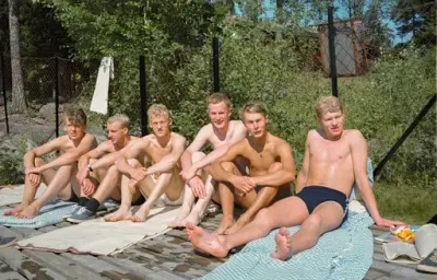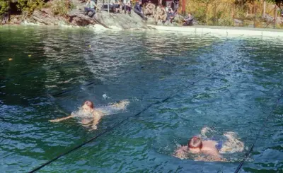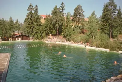 7.1954. Svømmebassenget er ferdig etter 3 års dugnadsarbeid.
