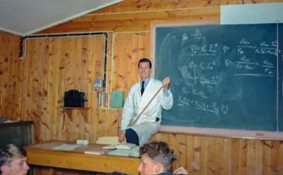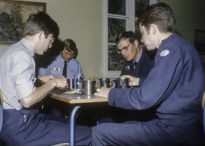 Tiden på Lutvann var en flott tid, kanskje den beste! Maten var topp og vi fikk «guffe» (salat) og skinke hver dag. Det var tett oppfølging med prøver hver uke, og beordret selvstudium: 1 kveld i uka med skår under 60% og 2 kvelder i uka med skår under 40%. Det ble også laget mye undervisningsmateriell, noe illustrert med artige tegninger. Noe laget jeg selv, men har ikke bevart noe. Er det noen som vet om eller har slikt materiell? Ellers var vi jo flinke til å notere fra undervisningen, jeg har bevart et hefte fra den første tiden (se vedlegg). «Korslutningsboksen» var en sak for seg. Min gikk dessverre opp i røyk da push-pull-koblingen i sluttrinnet brant og virket ikke siden. Men jeg var med å introdusere den nye generasjonen med etset kretskort. Lutvannsbibelen fikk jeg beholde da vi flyttet til Kjevik, den var jo populær! Min datter hadde nytte av den da hun jobbet Norsk Romsenter.