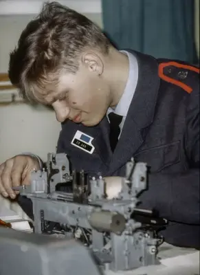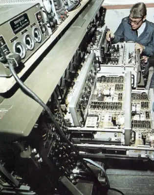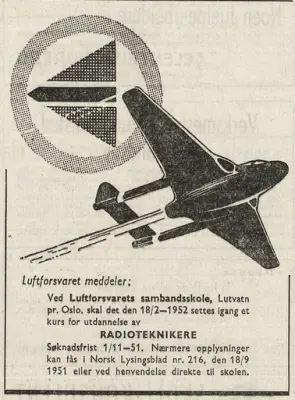 Midt i blinken Hvis vi nå eksempelvis tenker på det elektroniske fagfeltet - radar, radio, fjernsyn, elektroniske regnemaskiner, elektronisk måleutstyr, automatisering av industrien - så vet vi at det er et fagfelt som er i rivende utvikling og byr meget store arbeidsmuligheter både nu og i fremtiden. Forsvaret har skoler som er midt i blinken for en slik utdannelse. Luftvernartelleriet har skole i Stavern, Marinen driver radio- og radarutdannelse i Hirten og på Mågerøy utenfor Tønsberg. Flyvåpenet på Lutvann like utenfor Oslo og Hærens Samband på jørstadmoen ved Lillehammer. La oss ved denne anledning se litt nærmere på Flyvåpenets sambands- og radarskole ved Lutvann på Alnabru. Oberstløytnant T. Ringeide er skole- og stasjonssjef.