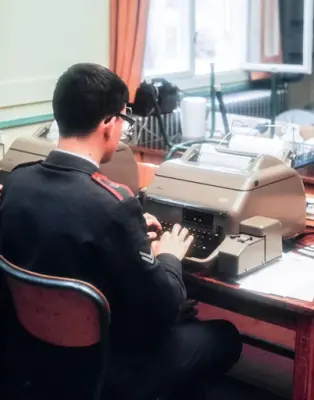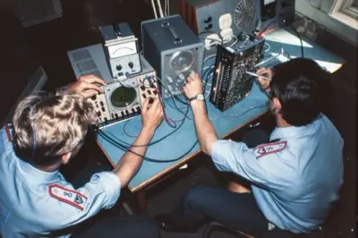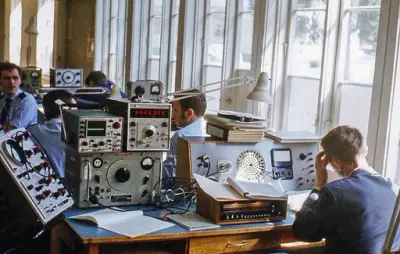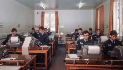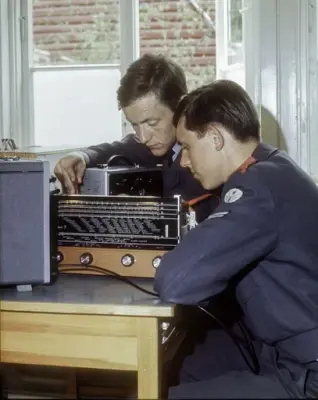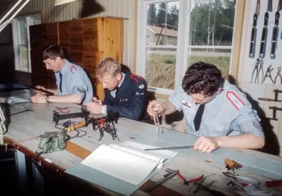 Og en rundtur i leiren ved Lutvann viste at man hadde satt teorien over i praksis. Overalt hvor man kom i undervisningsrommene var elevene opptatt med sine forskjellige oppgaver. En som skal bli radiotelegrafist , satt med øreklemmene stramt over hodet og lyttet spent på morsetegnene, radioteknikeren gransket radioens kompliserte "indre", radarfolkene syslet med sitt og fjernskriverne sendte og tok imot. Ivrig og intens virksomhet overalt.