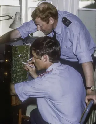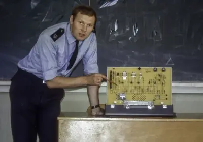 Ressurser Da som nå var det vanskelig med penger, da som nå måtte behovene bli heller overmodne før de ble luktet på. Men lykken ville at skolen i disse første og vanskelige år hadde en sjef som verken manglet initiativ, arbeidskraft eller evne til å manøvrere i vanskelig farvann, nemlig H.M. Nicolaysen. Enda viktigere var det imidlertid at Luftforsvarets daværende sjef, general Bjarne Øen, som en av de få, så at dette var et vitalt felt som måtte beherskes for å oppnå effektivitet i luften. Hans klarsyn og mot til å ta dristige avgjørelser ga støtet til at vi i dag har omfattende elektroniske systemer i operasjon, som vel de fleste ser på som en selvfølge. Tingene var ikke så selvfølgelig den gangen.