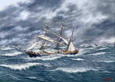 "Skeppet Ceylon om 370 reg:ton var det sista av fartygen, som byggdes på det Rettigska varvet i Gävle. Fartyget löpte av stapeln pingstaftonen år 1888 samt riggades till bark. Befälhavare blev sjökapten Anders Broman, som från pojkåren arbetat sig upp i rederiets tjänst. Han förde Ceylon till 1897, då han lämnade sjön för alltid. De kvarvaradne fartygen Monarch, Chili, Orient samt Ceylon övergingo till ett konsortium med mäklarfirman P. J. Hägerstrand i Gävle som huvudredare. Efter kapten Broman fördes fartyget av en kapten A. P. Jansson frå Roslagen. Sedan såldes Ceylon till Bergkvara i Småland, och en mörk decembernatt 1908 sjönk fartyget i Öresund vid ön Hven efter kollision med Wilsonångaren Nova av Hull. Ceylons besättning räddades. Tavlan visar fartyget under en orkanartad stormby i Indiska Oceanen 1889, utförd ur minnet av undertecknad, som var med ombord som lättmatatros. Hon innehar sockerlast från ön Mauritius och är på resa till Melbourne i Australien. Fartyget ligger för följande fyra segel: förstång, undre förmärssegel, som blåser i trasor, svigtat undre stormärssegel, s.k. ty seglet är fastgjort till hälften på rån samt stormasten.