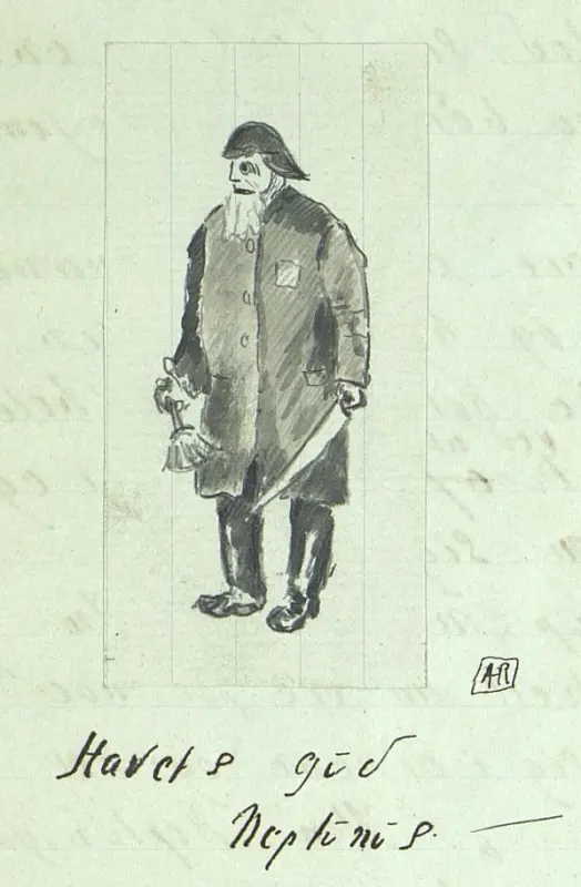 “Søndag den 30. september ; god vind. «venter at komme under ekvator i morgen i kveldingen og faar vel da det reglementerede besøk av Neptun. Her er mange som skal barberes og faa pass, saa der blir nok sjau i den anledning. Havfruer, havguder og havgudinner, der har sit tilhold her paa jordens midtlinje og her i de måneklare netter fremfører sin Liniedans.”