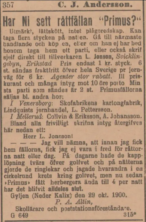 Råttfällorna beskrevs som utmärkta, lättskötta och inget plågoredskap som kunde ta flera råttor åt gången. Man hade även citat i sin marknadsföring där man kan läsa om en P. A. Altin från Nedre Kalix som skrev i Elfsborgs läns tidning 1900: ”Jag vill nämna, att innan jag fick hem fällorna, fick jag ej vara i fred för råttorna natt eller dag. På dagarne hade de kapplöpning tvärs öfver golfvet och på nätterna gjorde de ringlekar och jagade hvarandra i en cirkelrund krets kring golfvet, men nu sedan ”Primus” fått herbergera ända till 4 per natt ha det blivit alldeles slut.” Även rektor Fredrik Nordin var nöjd med sin råttfälla som han köpt för 1 krona: ”..det var en bra tingest, bättre än min katt. En natt tog den till och med två möss på en gång. Den förtjänar därför sitt namn ”Primus”, eller den första och förnämsta af alla råttfällor”.