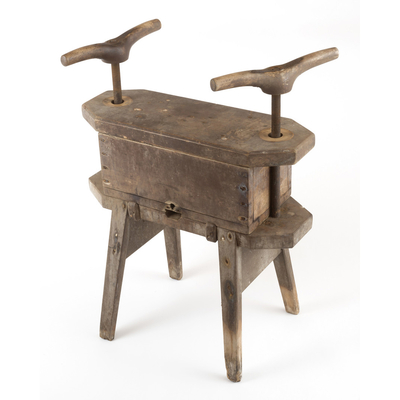 Saftpresse fra begynnelsen av 1900- tallet. Oppskårne epler legges i trekassa. Et lokk med presskubbe legges på. En tvinge i hver ende presser lokket gradvis nedover slik at eplene moses og saften renner ut. En trerist i bunnen av pressa hindrer eplerester i å blande seg med saften. Spor risset i bunnplaten sammen med en svak helling leder saften ut mot tappehullet som er plassert i senter av pressa.
