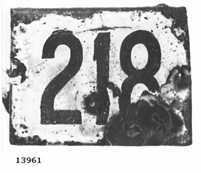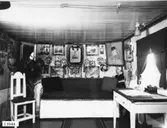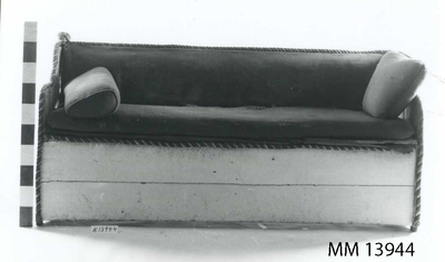 Soffa av trä, stoppad. Sidor och framsidan vitmålade. Rygg och lös sittdyna stoppade och klädda med blått tyg. Runt ryggstöd, sidostöd och framsidan är fastsatt med treslaget tågvi...
