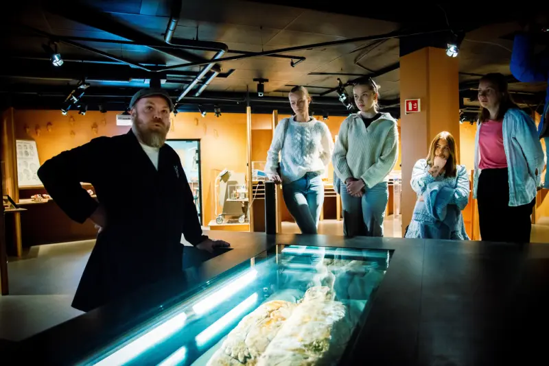 Antall stopp varierer noe, men elevene kan regne med 3-4 ulike stopp i utstillingen. Vi møter myrliket Maren. Hun ligger i en boks med glasslokk og elevene vil få anledning til å studere henne mens omviser forteller om hennes liv og død.